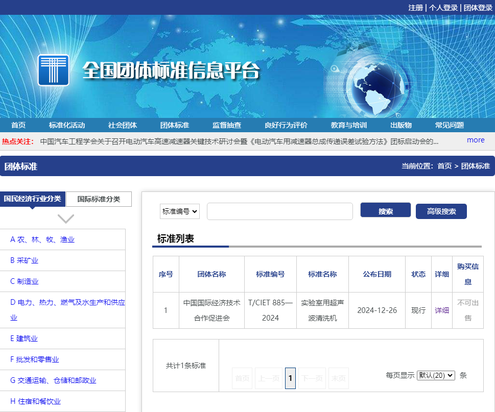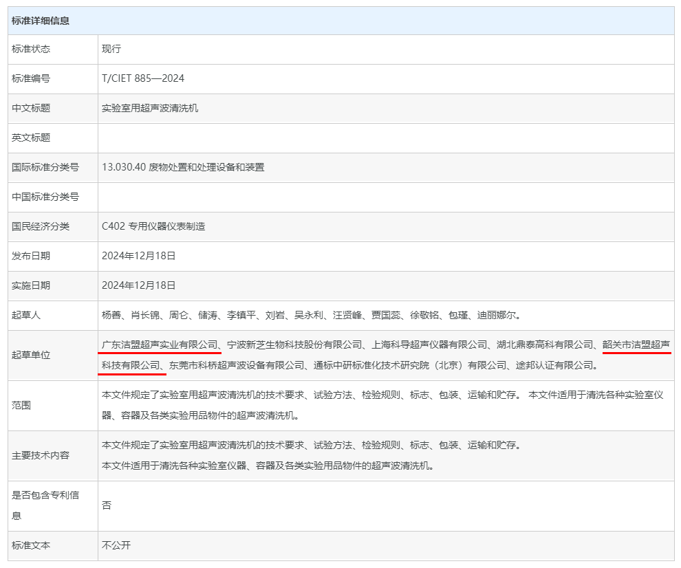近日,由广东洁盟超声实业有限公司(洁盟深那仪器)牵头制定的《实验室用超声波清洗机》团体标准(T/CIET 885—2024)通过中国国际经济技术合作促进会的批准,于2024年12月18日正式发布和实施。
